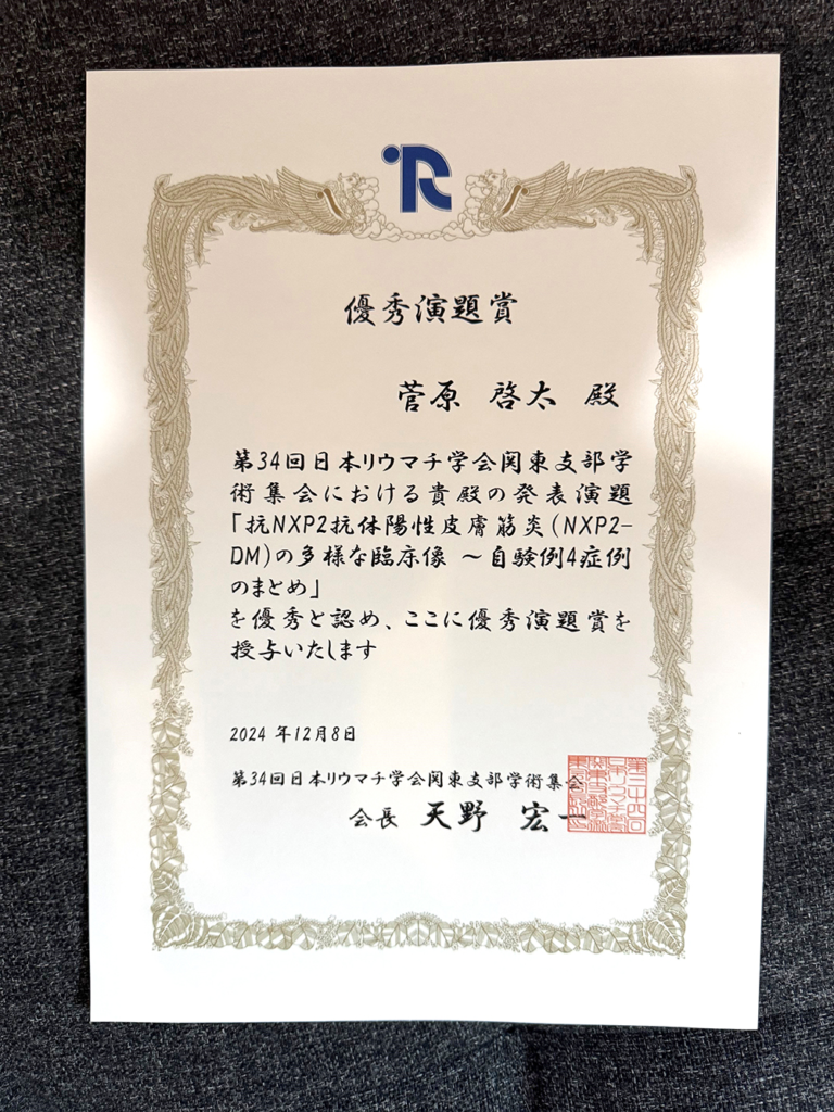 当科シニアレジデント菅原先生が、先日開催された日本リウマチ学会関東支部学術集会において「抗NXP2抗体陽性皮膚筋炎(NXP2-DM)の多様な臨床像 ~自験例4症例のまとめ」というタイトルの発表で優秀演題賞を受賞しました。よくまとめてくれました。おめでとうございます。昨年日本リウマチ学会学術集会での仲山先生の秀逸ポスター賞、今年日本リウマチ学会学術集会近未来のリウマチ医セッションでの仲村先生の優秀演題賞に続く受賞となります。