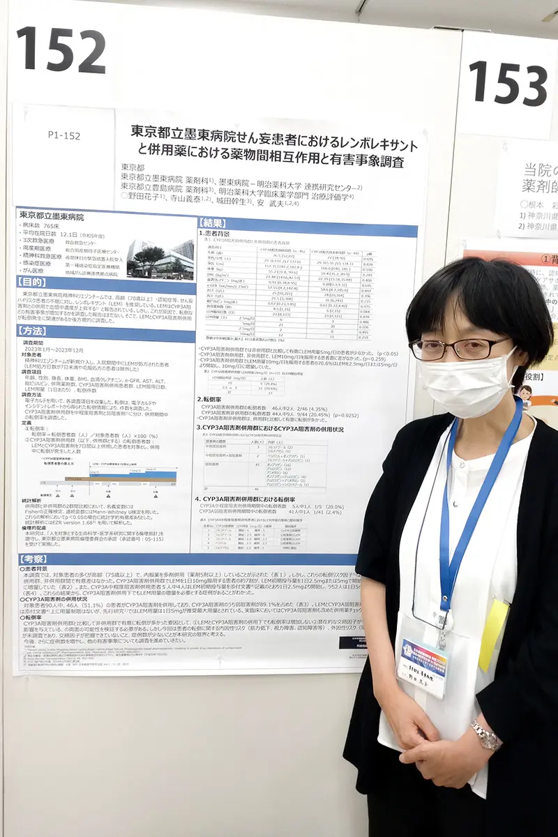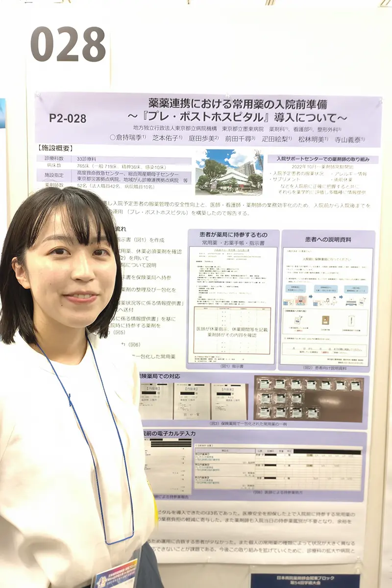 発表は、「東京都立墨東病院せん妄患者におけるレンボレキサントと併用薬における薬物間相互作用と有害事象調査」という演題で野田薬剤師が発表し、もう一つは、「薬薬連携における常用薬の入院前準備~『プレ・ポストホスピタル』導入について~」という演題で倉持薬剤師が発表しました。