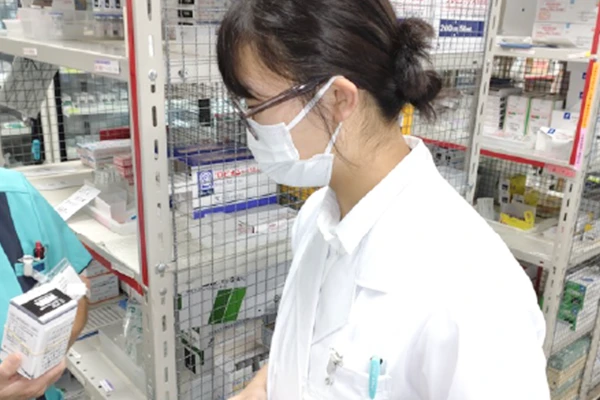 今年は、明治薬科大学より前半、後半各8日間に合計4名の薬学生の方に参加いただきました。内容は、実際に医薬品に触ってもらい、病院薬剤師の業務を体験してもらいました。