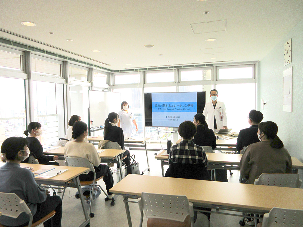 感染対策シミュレーションは、感染対策の基礎的な知識・技術を習得することを目標に、院内全職員を対象として行われている講義と演習からなる研修です。感染症科医師と感染管理認定看護師がインストラクターとなり、毎回20名の受講生を対象に、毎月第4金曜日の15:00~16:45に人財育成センター内で開催しています。